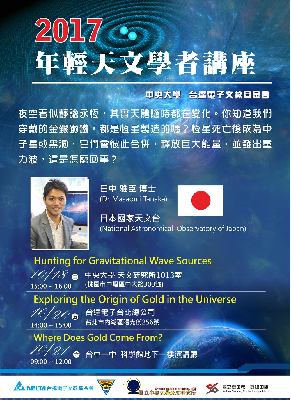 田中雅臣博士 (Dr Masaomi Tanaka) 於2009年取得東京大學天文學博士學位,目前為日本國家天文台助理教授。他來台發表三場演講,其中學術演講有關重力波的偵測,講題為 ”Hunting for Gravitational Wave Sources” (1) 10月18日(週三)下午3點,地點在中央大學天文所(健雄館1013室)。另外兩場為科普演講,內容是宇宙當中黃金的來源,分別是 (2) 10月20日(週五)下午2點,在台達電子台北總公司(台北市內湖路陽光街256號);(3)10月21日(週六)上午9點,在台中一中(台中市育才街2號)。其中第二場與第三場備有中文導讀,歡迎參加。