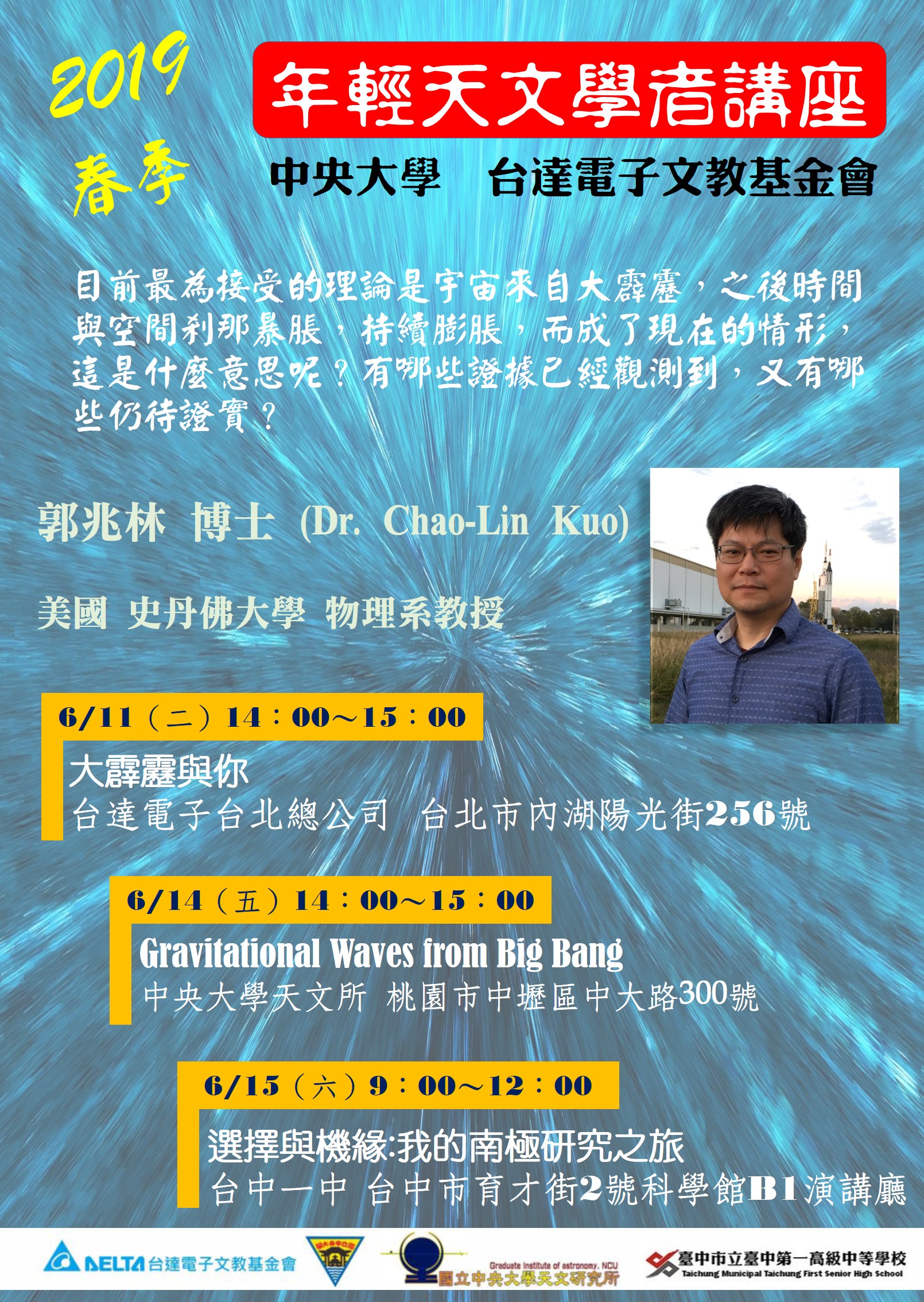 郭兆林博士 (Dr. Chao-Lin) 於 2003 年取得加州大學柏克萊分校天文物理學博士學位,目前在史丹佛大學擔任教授。他將來台發表三場演講,(1)學術演講在 6月 14日(週五)下午 2 點,地點在中央大學天文所(健雄館1013 室),講題是 “Gravitational Wave from Big Bang”。另外兩場為科普演講,內容為大霹靂及南極研究之旅,分別是 (2) 6 月 11 日(週二)下午 2 點,在台達電子台北總公司(台北市內湖路陽光街 256 號),以及 (3) 6 月15日(週六)早上 9 點,在台中一中(台中市育才街 2 號)。其中第二場與第三場以中文進行,歡迎參加。