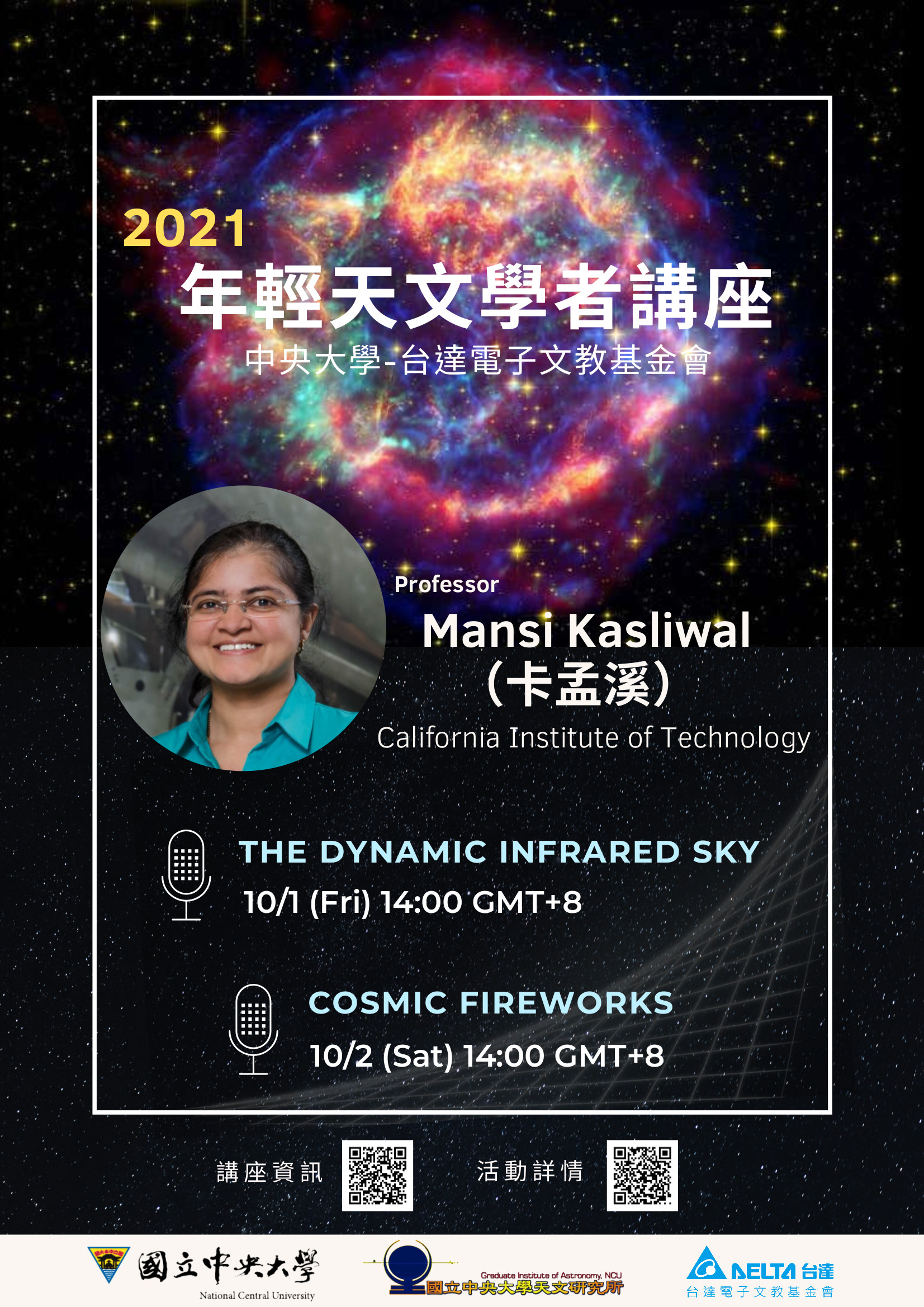 Kasliwal 教授將發表兩場網路即時演講:(1)學術演講在 10月 1日(週五)下午 2 點 講題為 “The dynamic infrared sky”,以紅外波段來研究宇宙天體與現象。另一場為(2)科普演講在 10月 2日 ((週六)下午 2 點, 講題為 “Cosmic Firework”,內容為太空中的劇烈爆發現象。
