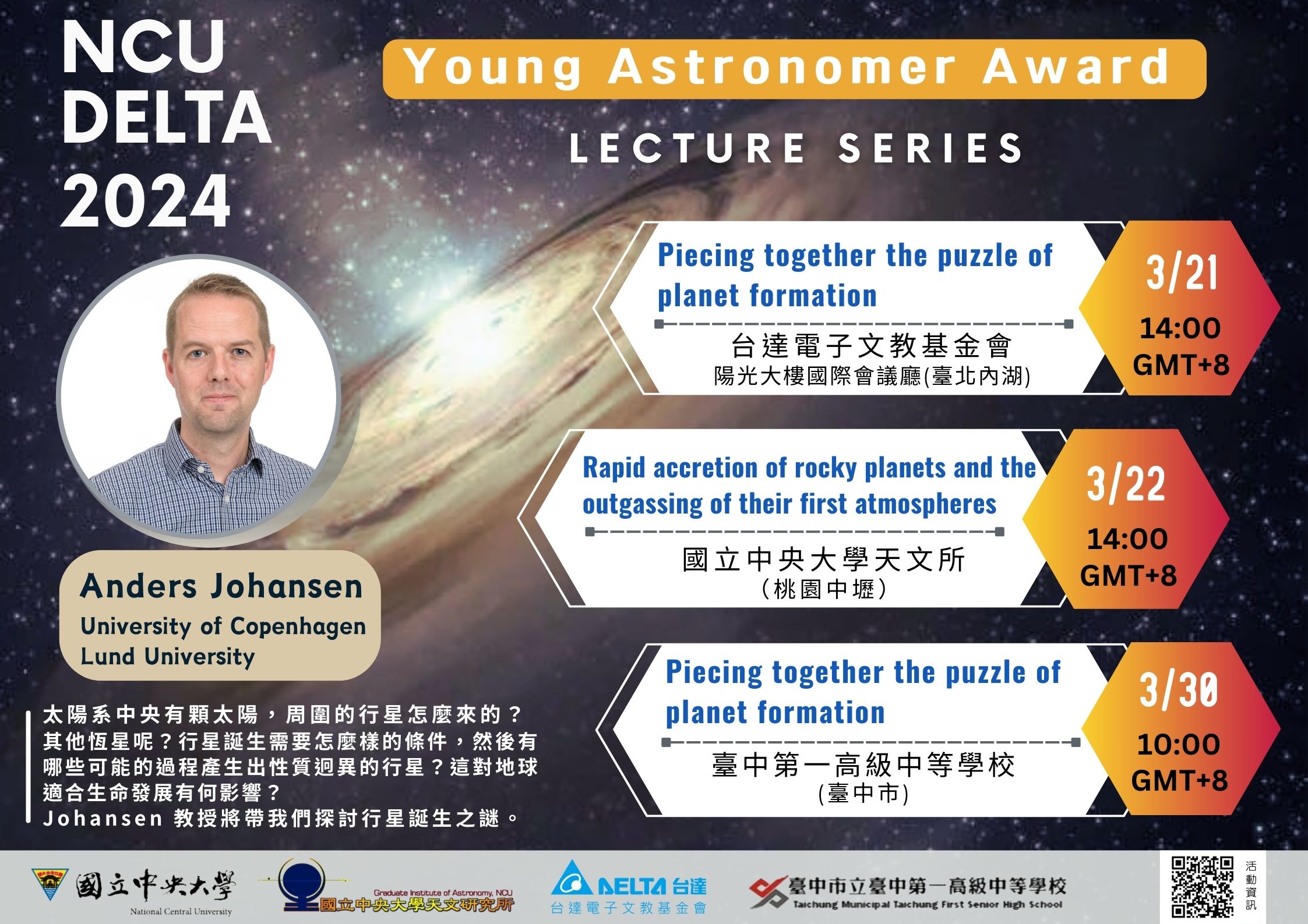 (1)科普演講,3月21日(週四)下午2點,地點在台達電子台北陽光大樓 國際會議廳(台北市內湖區瑞光路188巷38號1F),講題是"Piecing together the puzzle of planet formation"