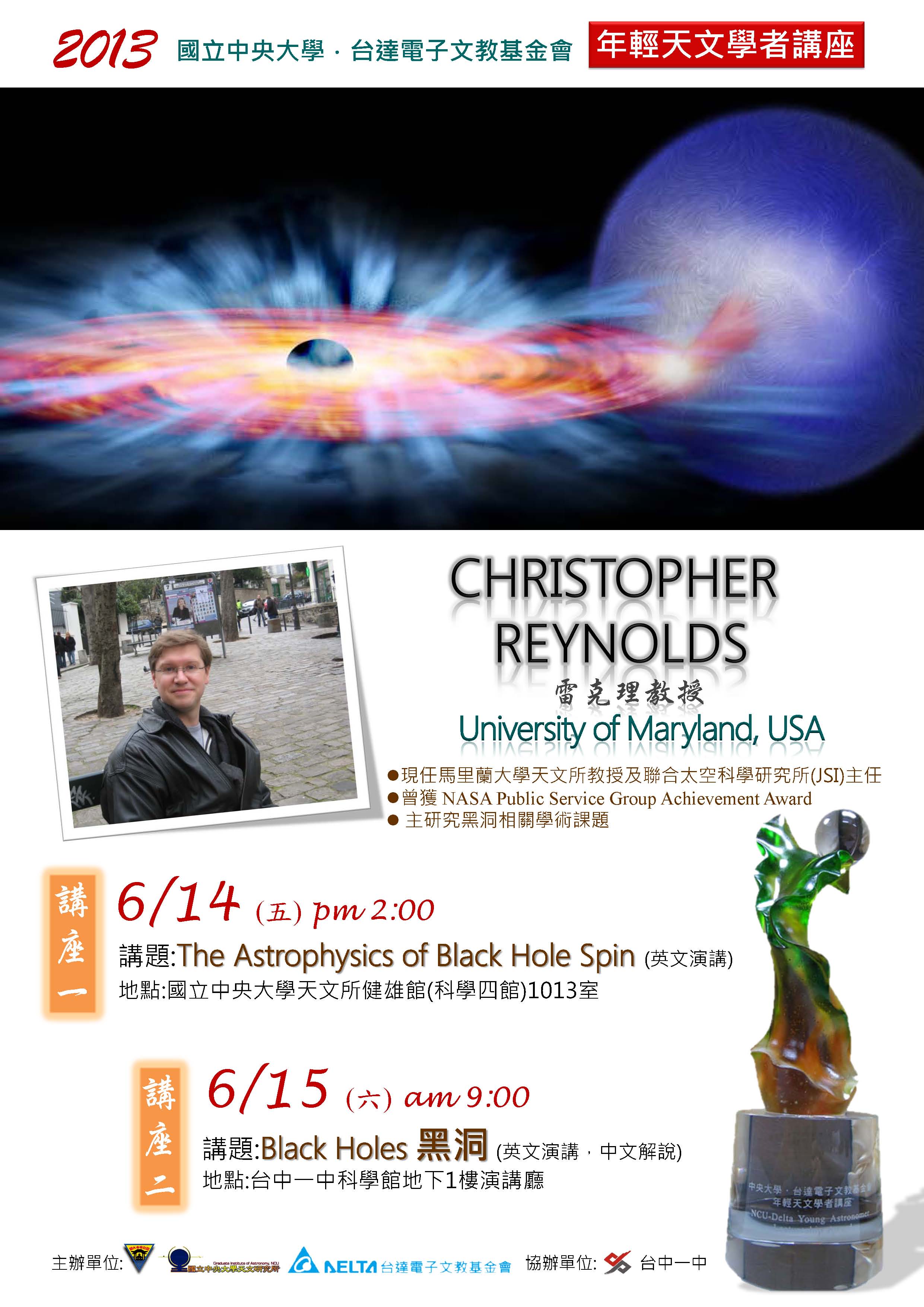 中央大學與台達電子文教基金會共同頒發的「年輕天文學者講座」主表彰年齡四十五歲以下,在研究領域有卓越表現之國際天文學者,本講座活動由中央大學執行,經費則由台達電子文教基金會每年提供台幣一百萬元,得獎者除來台機票補助,另將獲頒講座獎金。本次2013年春季獲獎者為英國的雷克理教授 (Professor Christopher S. Reynolds),為現任馬里蘭大學天文所教授及聯合太空科學研究所主任。