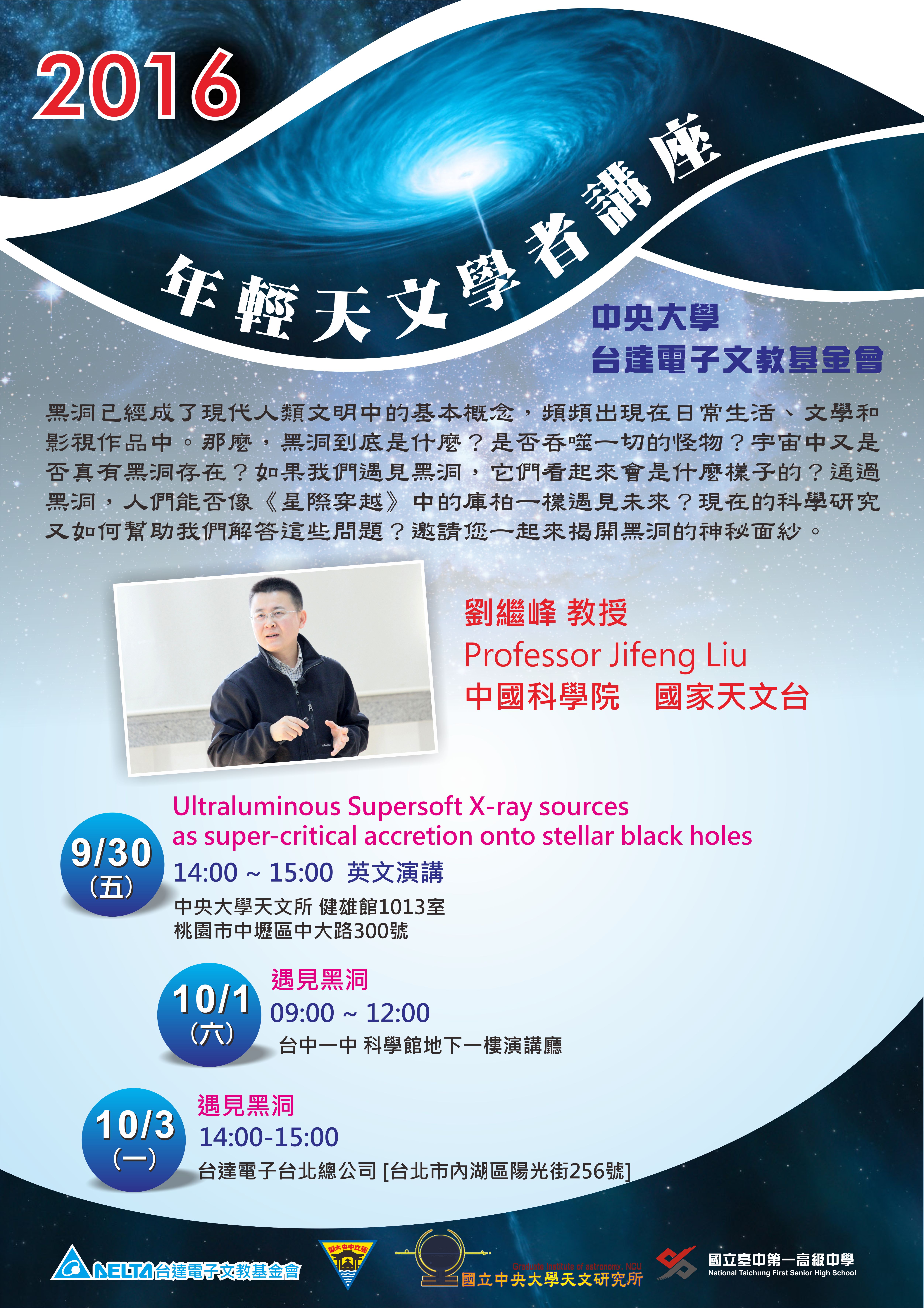 劉教授的演講包括 (1) 9月30日(週五)下午兩點,在中央大學天文所(健雄館1013室)學術演講,講題為“Ultraluminous Supersoft X-ray Sources as Super-critical Accretion onto Stellar Black Holes”;(2) 10月1日(週六)上午九點,在台中一中(台中市育才街2號)演講 “遇見黑洞”;(3) 10月3日(週一)下午兩點,在台達電子台北總公司(台北市內湖路陽光街256號),講題“遇見黑洞”。後兩場為中文科普演講,歡迎參加。