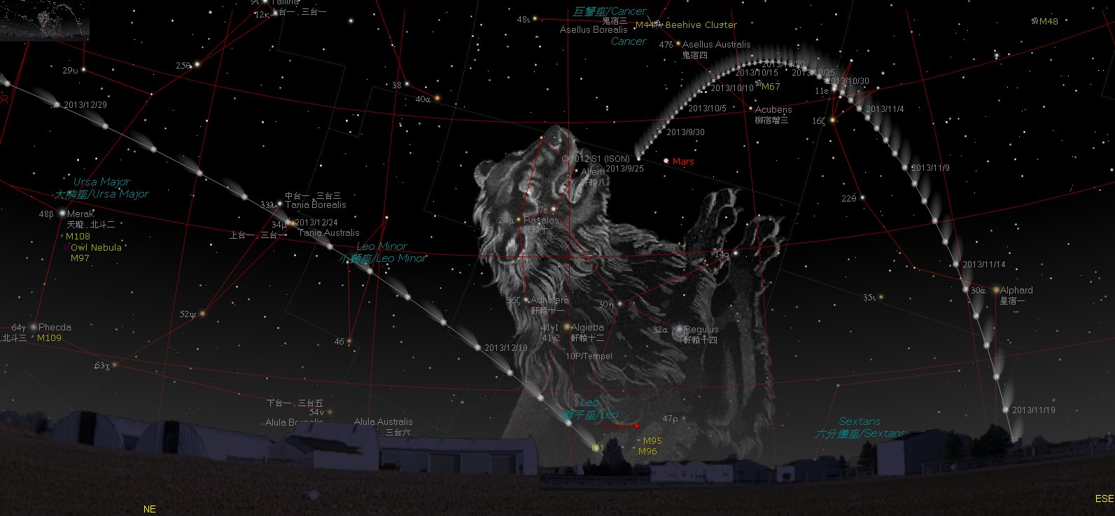 艾桑彗星的運行路徑,天文學家們預計這次將是它第一次,也是最後一次進入內太陽系,因為它將很有可能被太陽的重力撕裂而灰飛煙滅。根據目前估算艾桑彗星將於今年11月28日從距離太陽約116.5萬公里(約2.7個太陽半徑)處掠過,屆時彗核表面溫度約為三千度,此一溫度足以融化很多金屬,如果艾桑彗星順利倖存下來,那今年12月北半球的夜空將是精彩可及。圖五為艾桑彗星在日出前從九月到十二月的預測位置。