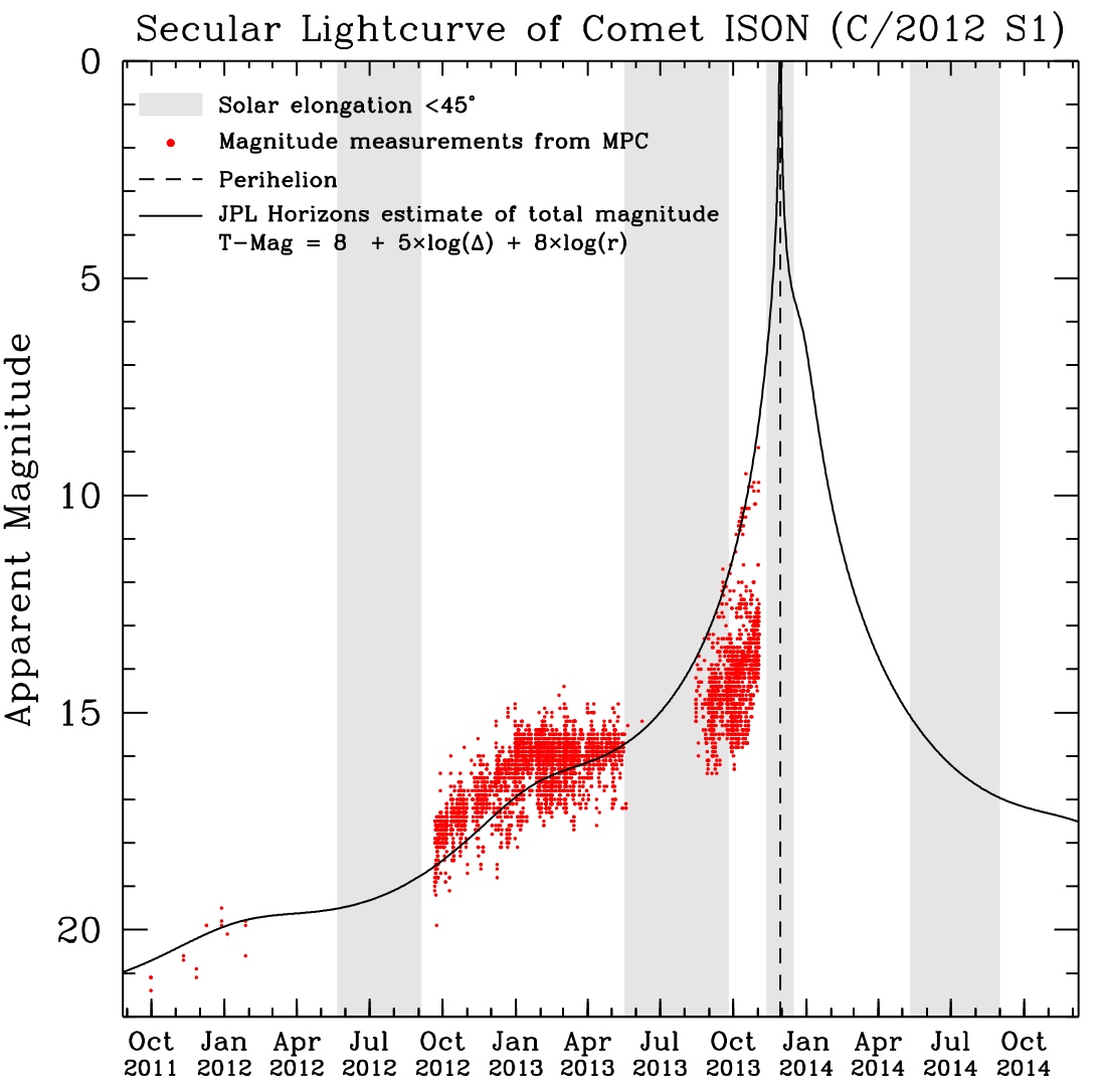 告別數個月的亮度乾旱期後,艾桑彗星的亮度逐漸增亮,但從模擬得知(圖二,不同模擬有不同結果!)其最大亮度已經不再讓艾桑彗星具有”世紀彗星”的頭銜,但仍有2013年年度彗星風采。