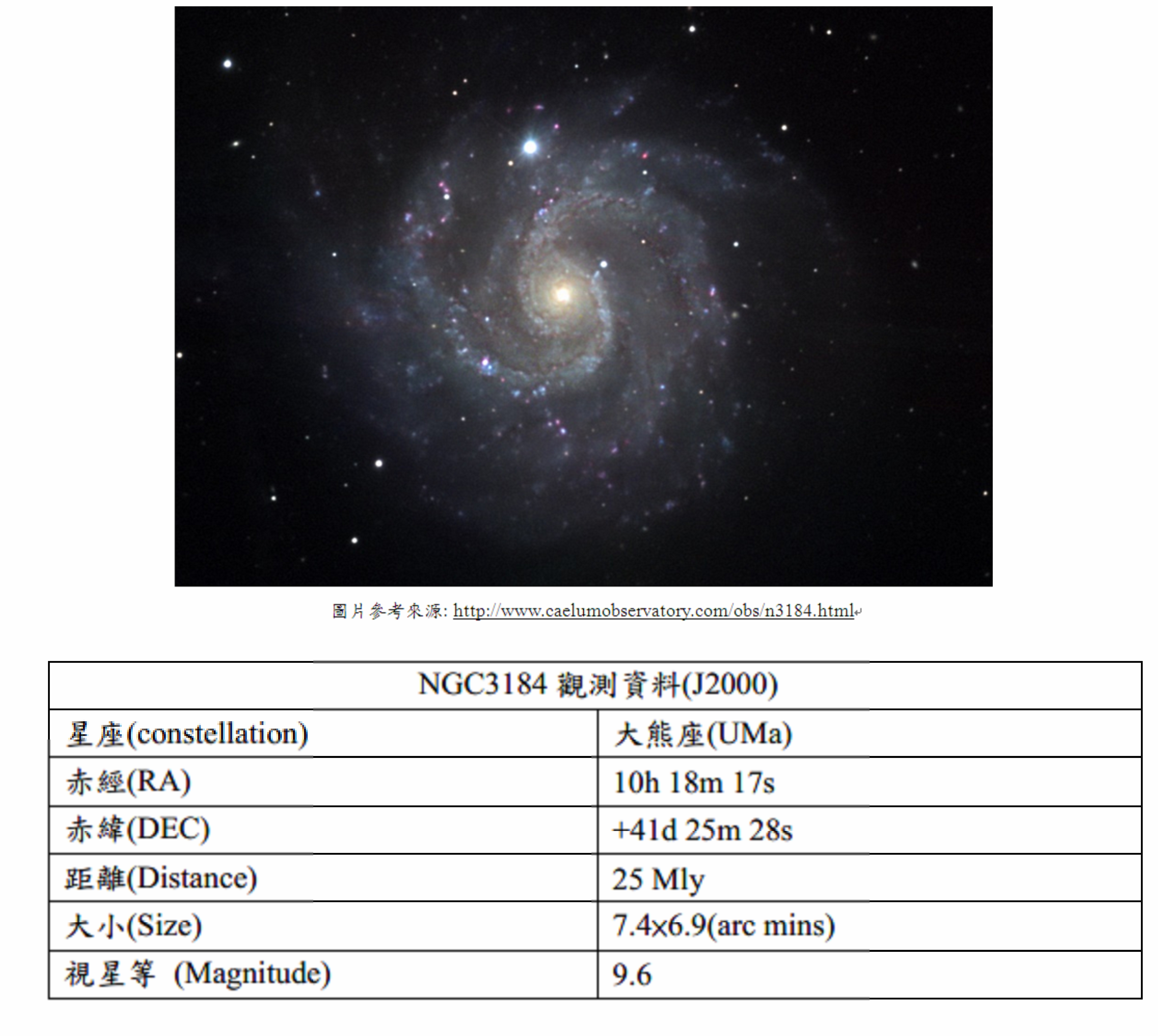 NGC3184屬螺旋星系(spiral galaxy),在距離我們約40萬光年之外的大熊座(UMa)之中,其內部有兩個HII區域分別是NGC3180與3181,這是誕生新恆星重要的關鍵,值得注意的是NGC3184有著豐富的重元素並且於1999年12月9號被偵測內部有超新星爆炸,目前NGC3184內還有至少三個的超新星。
