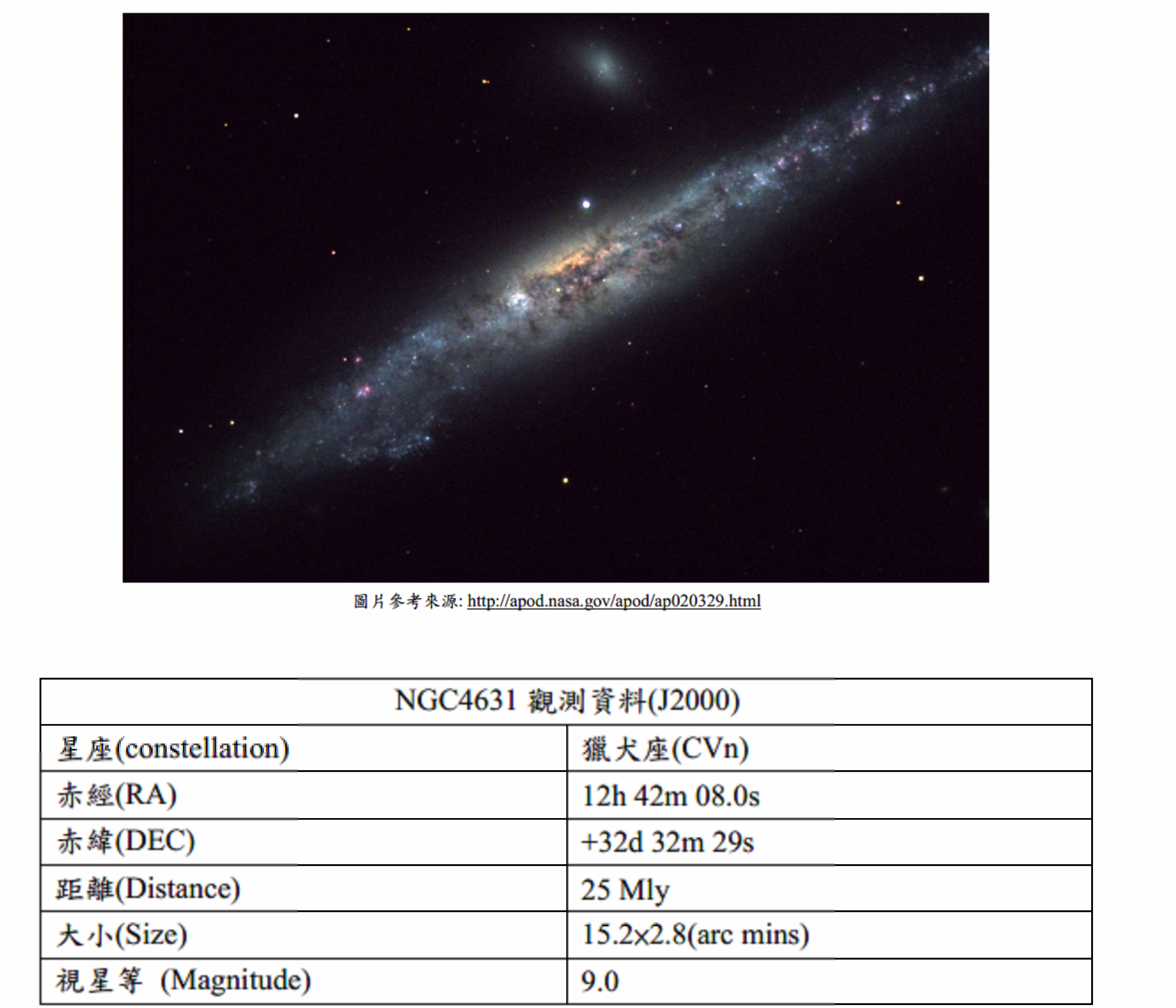 NGC4631屬螺旋星系,但可能因受附近星系引力影響,使其形體扭曲宛如鯨魚故也被稱作Whale Galaxy(鯨魚星系) 或 Caldwell 32(柯德韋爾32),位在獵犬座方向以側面面向著我們,有助於我們了解星系盤面上氣體與恆星分布,而中心強烈的星爆產生的高能及塵埃,能促使恆星形成,當中大質量恆星死亡後易產生超新星爆炸,這些爆炸的強烈風暴,使NGC4631充滿著X-ray(X射線)。