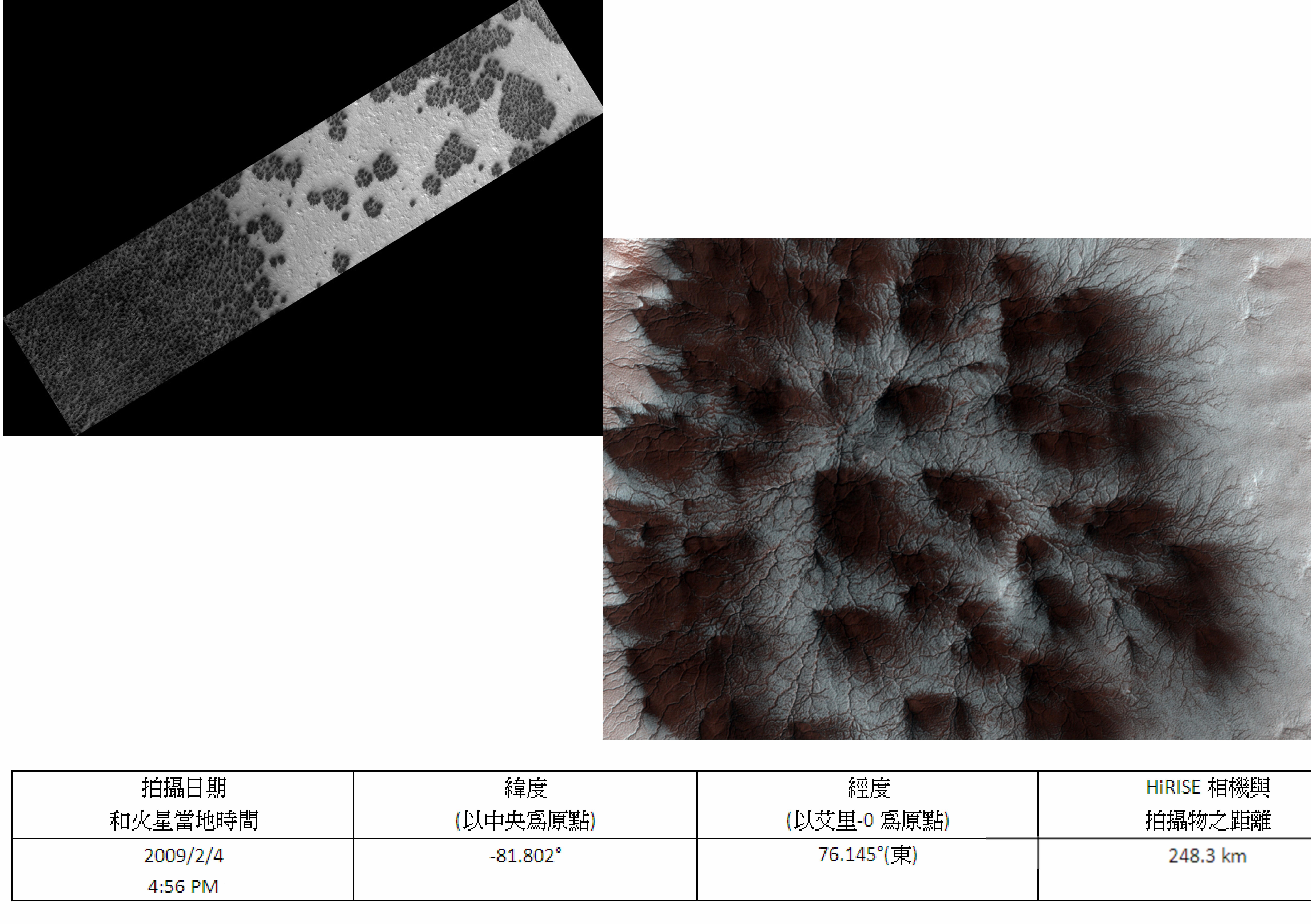 火星在每年春天的極冠地區,因為成分為二氧化碳冰(乾冰),所以當氣溫上升時產生昇華反應,就造成像圖裡一樣星爆狀的地形。在其他地區,這些徑向的凹槽因為形狀的關係,也被稱作“蜘蛛”。從圖裡可以看出從中心延伸出去的樹枝狀的數量是中心的好幾倍。這些凹槽一般被認為是由在季節性的冰下面的氣流將塵埃帶出所造成的開口。這些塵埃以扇形的形狀沉積在冰的表面。 火星的季節性極冠主成分為二氧化碳冰(乾冰),在春天的時候會有昇華作用導致提高火星的大氣壓力,而秋天時則會有凝結作用產生。研究季節性過程中,我們觀察極冠在盛衰的情況去調查火星上兩個大的尺度效應和昇華與冷凝的局部細節。藉由研究當前的地區級過程,我們可以瞭解更多如何解釋火星上氣候變化的地質紀錄。